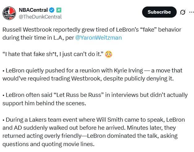 10月21日,美国人亚龙·韦茨曼更新了一篇内容丰富的文章,详细介绍了威少在湖人队的经历,同时也透露了威少不喜欢詹姆斯的几个原因。威少此前为球迷签名时,并没有在湖人球衣上签名。这说明威少本人并不喜欢湖人队的经历。那么詹姆斯到底做了什么惹怒了威少呢?据记者透露,詹姆斯私下鼓励欧文加盟湖人,但合同属于威少,但詹姆斯并没有批准。詹姆斯公开表示他希望威少做自己,但私下里他不喜欢见到威少。威斯布鲁克看着詹姆斯吹嘘自己多么喜欢看电影《教父》,但他连电影中的经典台词都说不出来。他随身带着《马尔科姆自传》一书。当著名影星威尔·史密斯加入队伍时,史密斯谈到当时他已经被踢出奥斯卡奖了。在得知史密斯将成为乔球队上场后,詹姆斯和安东尼戴维斯立即离场。在美国这种行为通常意味着这个人不友善,应该避免!威少本人想要被罚下,但贝弗利阻止了他,表示离开球场是球队领袖唯一的治疗方法。威斯布鲁克别无选择,只能留在沙子里。在与湖人队谈判后,詹姆斯和浓眉哥回到了球馆。詹姆斯的表现就像变了一个人。他非常热情,表现得就像史密斯的老朋友一样。他在场上主动提出史密斯电影中的台词。威斯布鲁克目睹了整个事件,并表示他感到震惊。我简直不敢相信。我不能摆出那张假脸。目前美国多家媒体都报道了这一消息,但詹姆斯的球队尚未做出回应。
